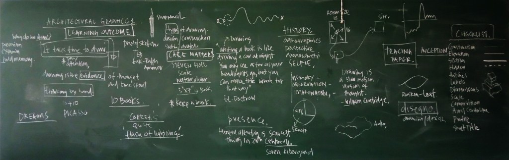 After a cycle of teaching online, i am rediscovering the nuances of the blackboard. It has a certain slowness, and allows to grow thoughts collectively as the class proceeds. It traces the emphasis and the hesitations of the teacher, simultaneously. It is an evidence of overlapping thoughts and time, unlike a digital presentation which displaces time. Here the attempt was to summarise the learning outcome of the first semester drawing course. It traced all the things we spoke about the need to ‘draw’. There is a certain pleasure to look at the final mess, like the one we have when we cook our own food.