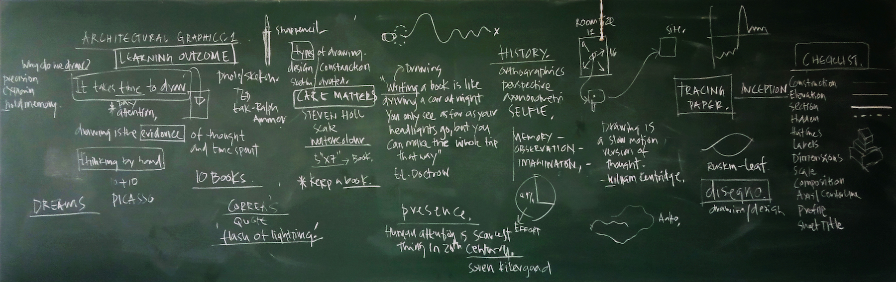 After a cycle of teaching online, i am rediscovering the nuances of the blackboard. It has a certain slowness, and allows to grow thoughts collectively as the class proceeds. It traces the emphasis and the hesitations of the teacher, simultaneously. It is an evidence of overlapping thoughts and time, unlike a digital presentation which displaces time. Here the attempt was to summarise the learning outcome of the first semester drawing course. It traced all the things we spoke about the need to ‘draw’. There is a certain pleasure to look at the final mess, like the one we have when we cook our own food.