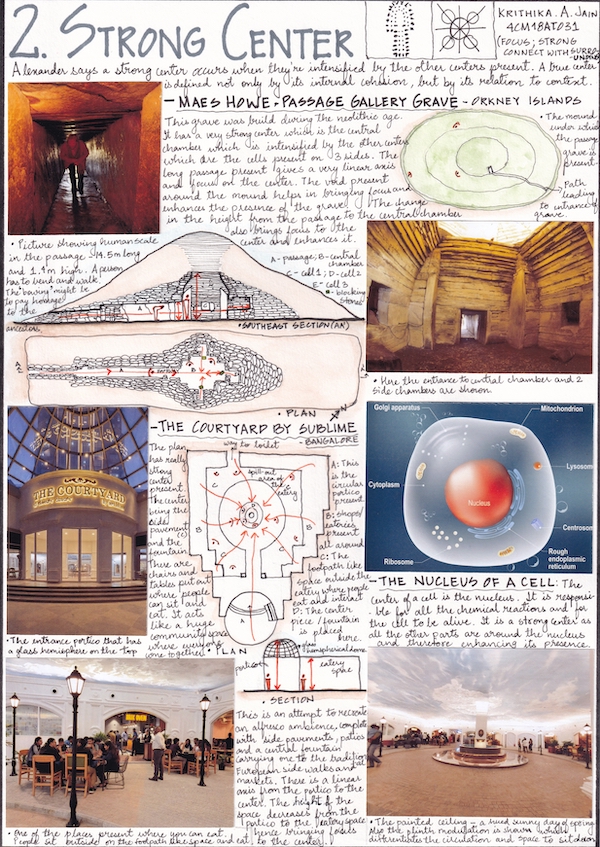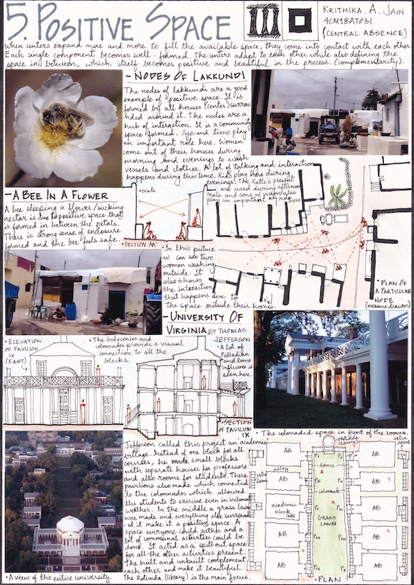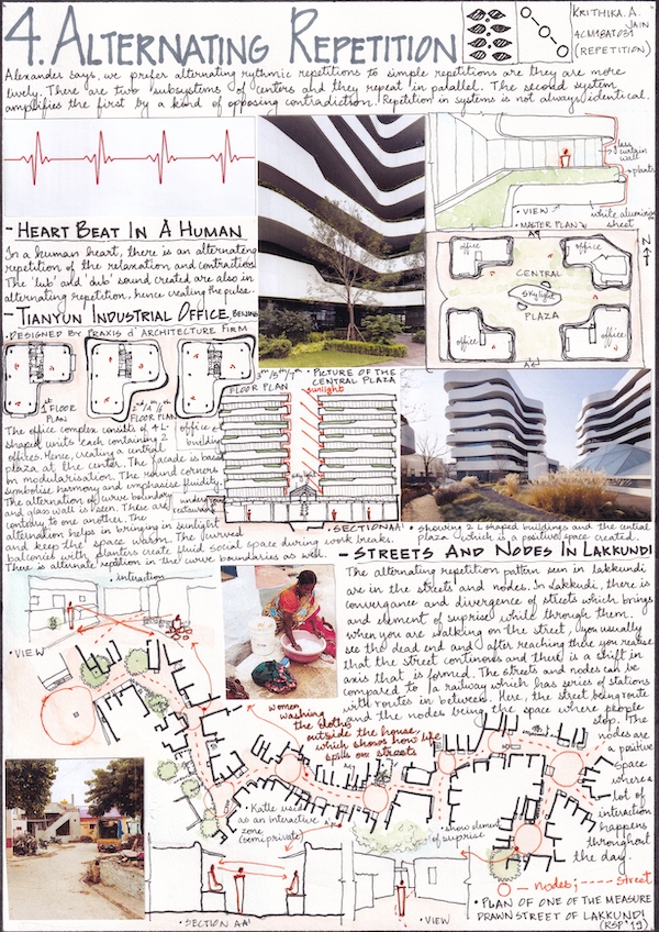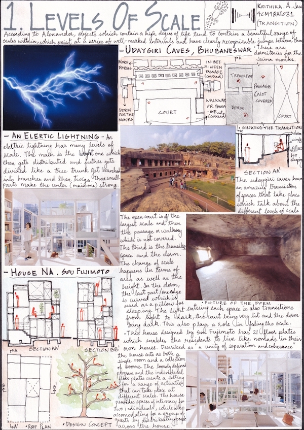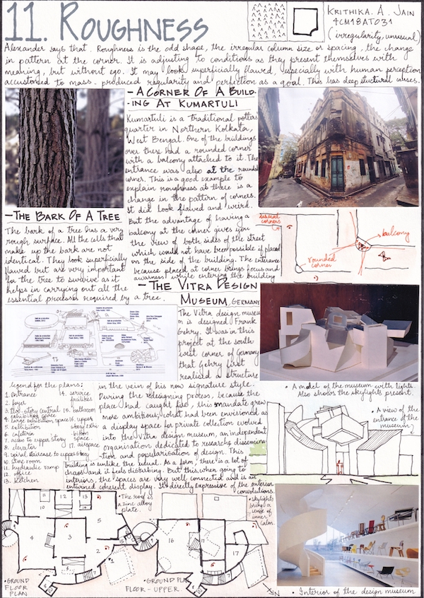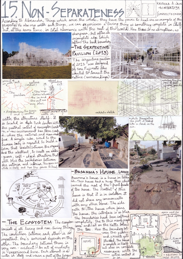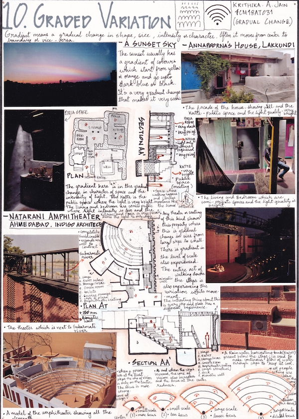 Student’s assignment from my theory class to illustrate Christopher Alexanders 15 principles in a more elaborate way. I have discussed this earlier too here. I feel it is a brilliant and useful structure with a potential to interpret in many ways. In this case the assignment was to relate each principle with 3 illustrations : a natural/scientific phenomena, a place/project visited, a palace/project studied. Krithika reinterpreted Christopher Alexander’s principles in a very comprehensive way. She uses this theory assignment as an ‘organising tool’ to structure her own experiences and ideas. She brings back her experiences from various study trips and measure drawing trips and weaves them to make her specific set of ideas which she can revisit. The tool of collage format (sticking photos + hand drawings) also enhances the value to this exercise of organising ideas.