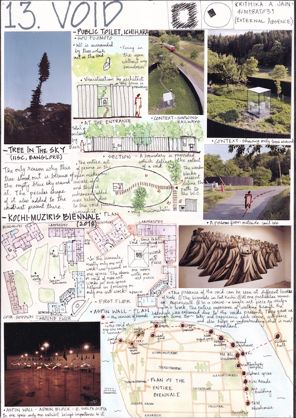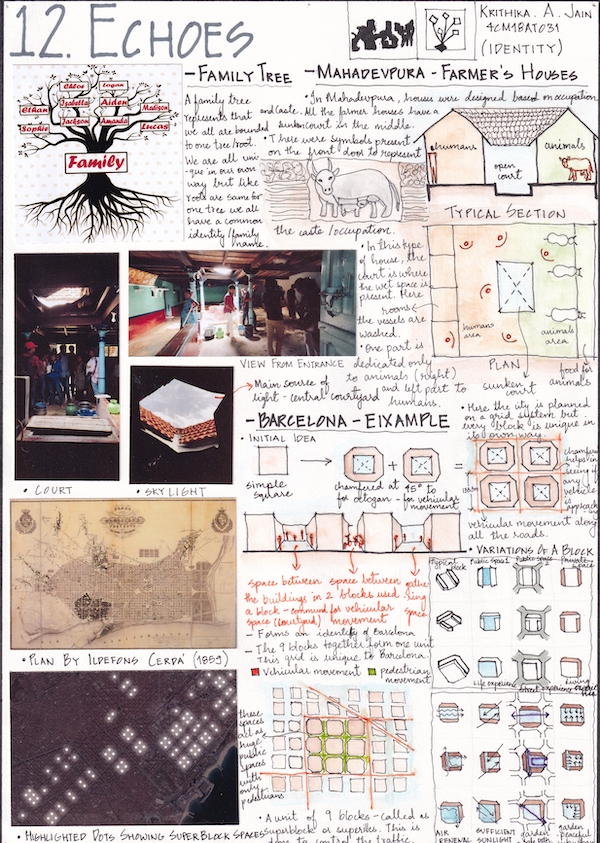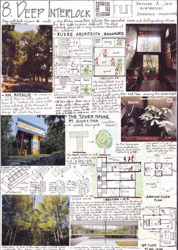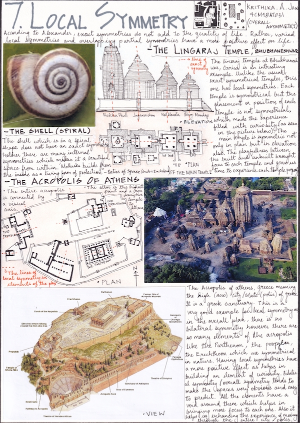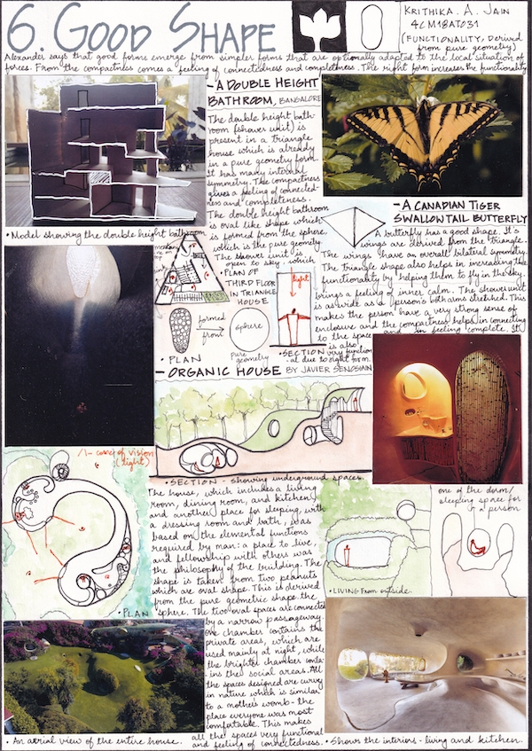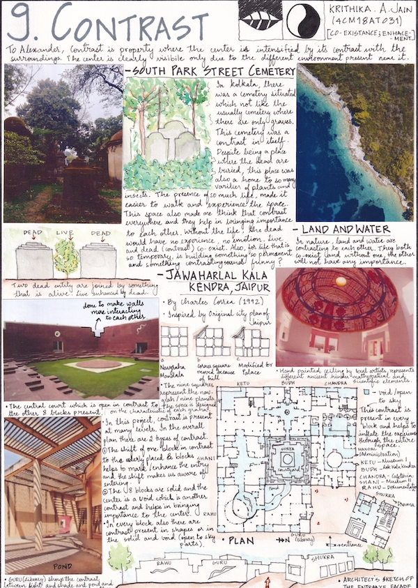 Student’s assignment from my theory class to illustrate Christopher Alexanders 15 principles in a more elaborate way. I have discussed this earlier too here. I feel it is a brilliant and useful structure with a potential to interpret in many ways. In this case the assignment was to relate each principle with 3 illustrations : a natural/scientific phenomena, a place/project visited, a palace/project studied. Krithika reinterpreted Christopher Alexander’s principles in a very comprehensive way. She uses this theory assignment as an ‘organising tool’ to structure her own experiences and ideas. She brings back her experiences from various study trips and measure drawing trips and weaves them to make her specific set of ideas which she can revisit. The tool of collage format (sticking photos + hand drawings) also enhances the value to this exercise of organising ideas.