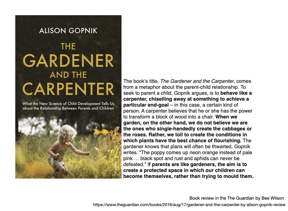Teaching and gardening In preparing for a talk on pedagogy, I came across this wonderful analogy of the parent as ‘carpenter’ and a ‘gardener’ Share this: Click to email a link to a friend (Opens in new window) Email