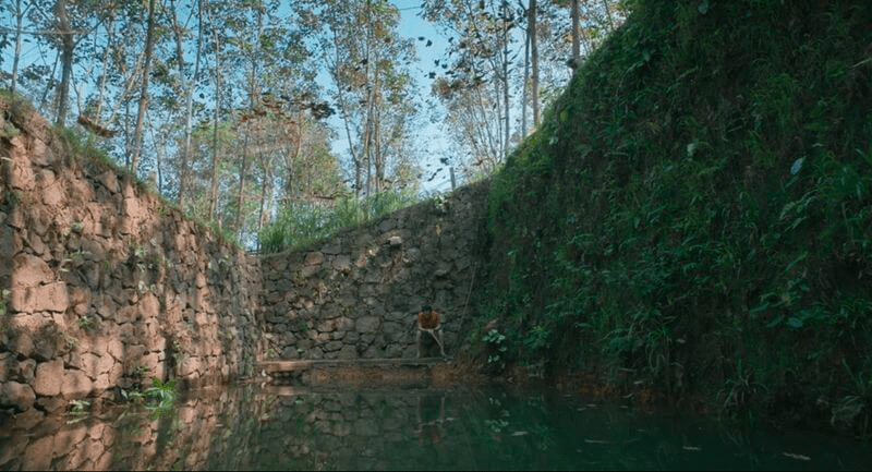 While watching this brilliant Malayalam movie Joji, i had made a quick note on the well (or pond) in my notebook. I was intrigued by the stone retaining wall registering the slope of the landscape.The net tied on the top to hold the falling leaves adds to the degree of enclosure. In the movie, it is in this well Joji plots up the evil ideas to kill his own father. A place where he is himself, devoid of the mask of innocence he is wearing in the house otherwise. The writer of the movie Shyam Pushkaran says “The idea was that Joji, as a child, had a fort at this pond, Whenever he felt abandoned by his father as a child, he would go there and cry. The pond was a comfort to him. He returns there after the murder to seek comfort.” (1) In contrast to his own closed bedroom inside the house, the open well, slightly far away from the house, helps him grow his intentions is private. Two facts, which i figured out later about making of the movie, made me more curious. The well was added to the existing plantation to shoot these important scenes. And another fact is that Shyam completed the script after the location is chosen(2)( A classic move which Frampton would have loved to indicate in his ideas of critical regionalism). The need for the well is a great reminder on what has architecture to offer. A sense of enclosure in the form of a refuge, a frame to articulate darkness and most importantly an interior space. Architecture in India has always had affinity towards the subterranean and the cave. Like the stepped wells. And this well is a classic illustration of that primal urge to move into the ground.