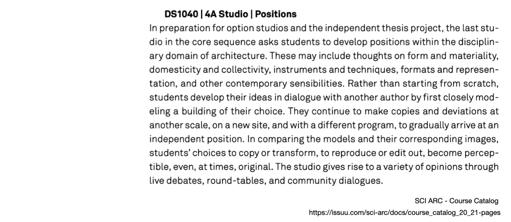 So in preparing for new design studio for 5th semester students at WCFA, i am planning to engage in a similar playing field. where we ‘reinterpret a canonical project’ to act as a point of entry into the semester. This way of learning from the masters has been a familiar trope in design studios. It is just here i am looking at the project rather than the architect . A perspective i learnt from Prof K B Jain at CEPT. He always talked about the project, rather that the architect. I think this is a more accommodating way to look at ideas, as every architectural project is a result of a collaboration. Below is a note from SCI ARC, on a possible method of enquiry in this direction.