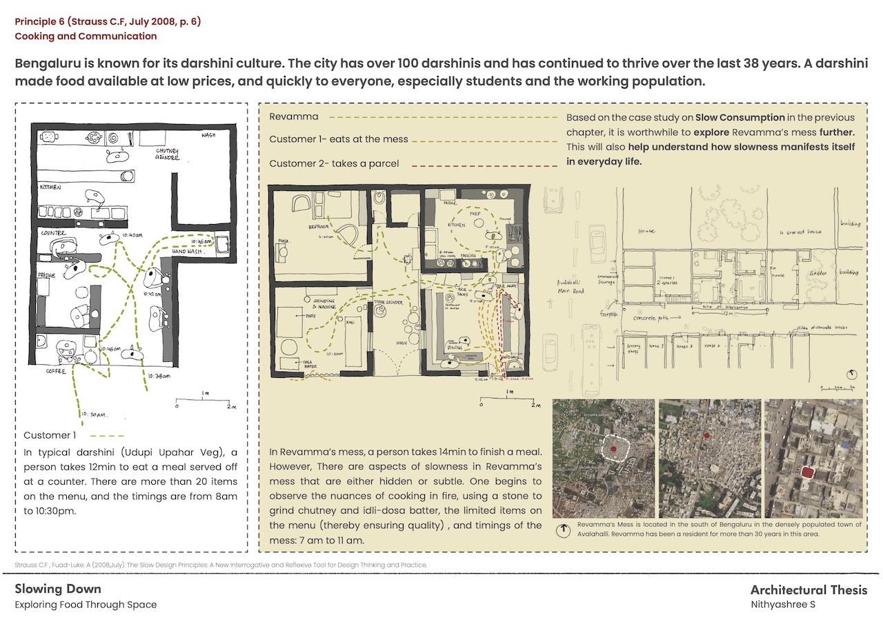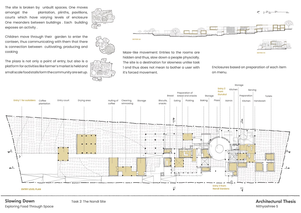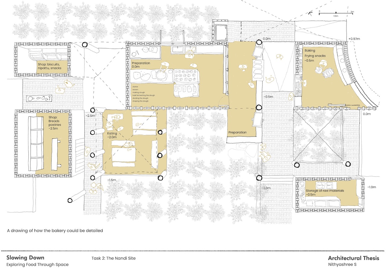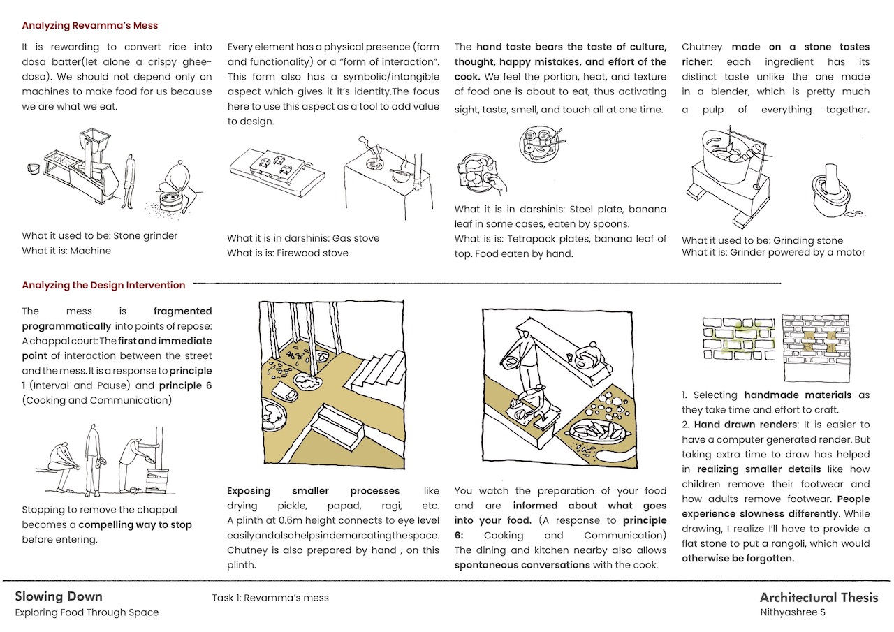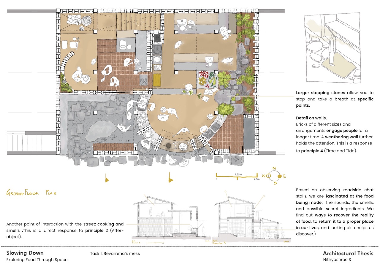 Nithyashree (WCFA, Batch 2017) comprehensively translated the initial research into design principles and spatial ideas. From the beginning, she sharply curated her intuitive sense of reading architectural space and environments into a focussed research on slowness and food. Her elegant and delicate drawing capabilities helped her carry the intricacies of slowness from an intellectual framework into an intuitive design process. I was also fascinated by her reading of an ordinary and simple space like Revamma’s mess and also imagine richer spatial possibilities in it. It was engaging to see Nithya pay attention to subtle environments and architectural possibilties hidden in the chaos of urbanity of Bangalore.