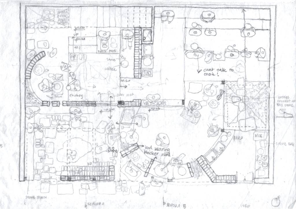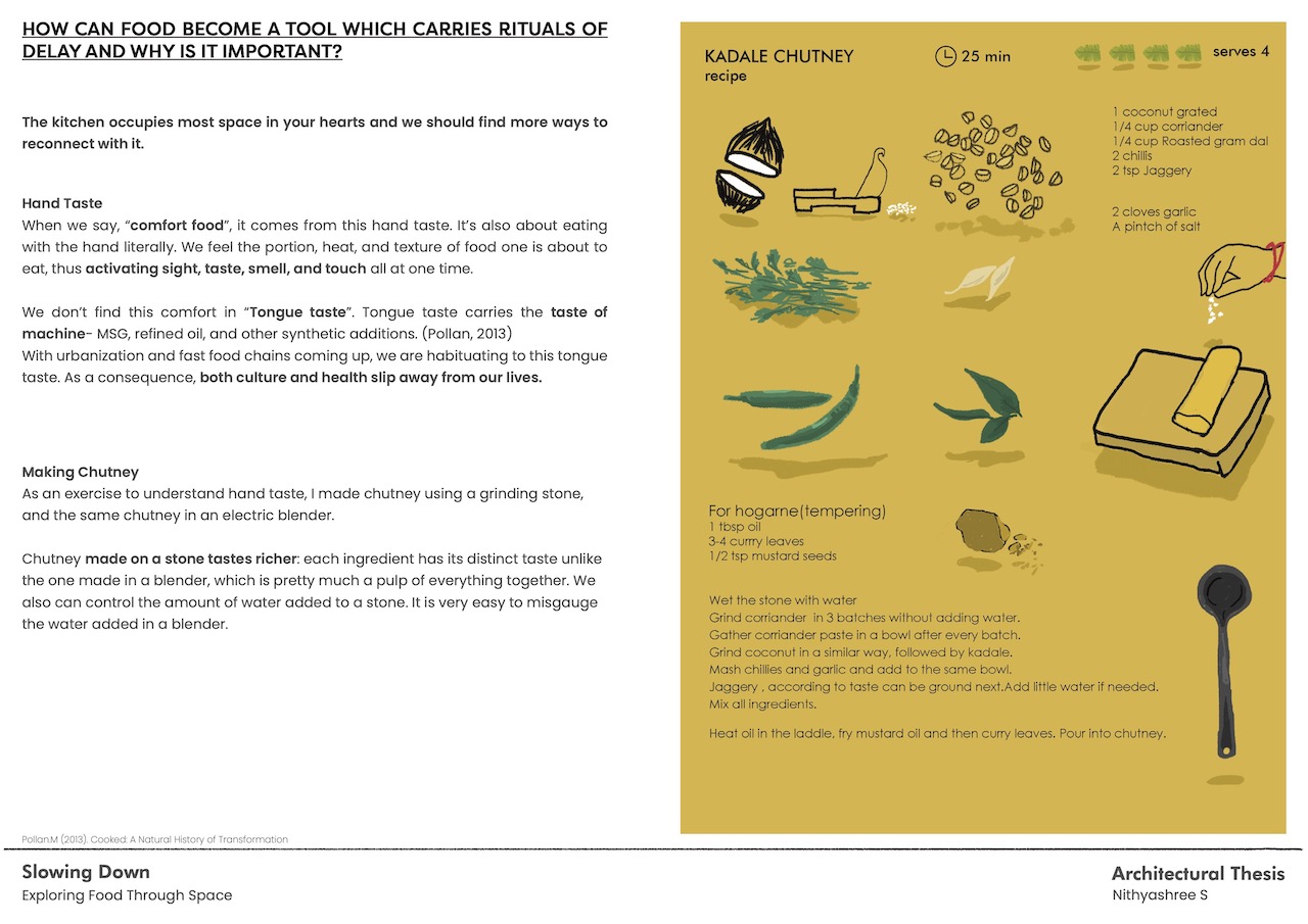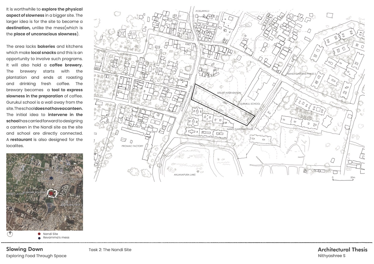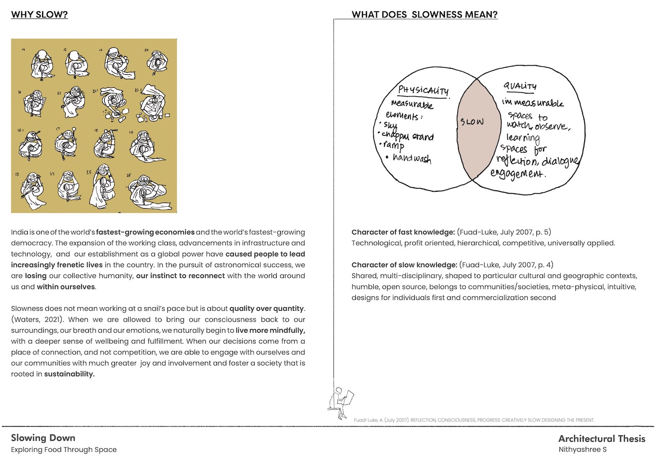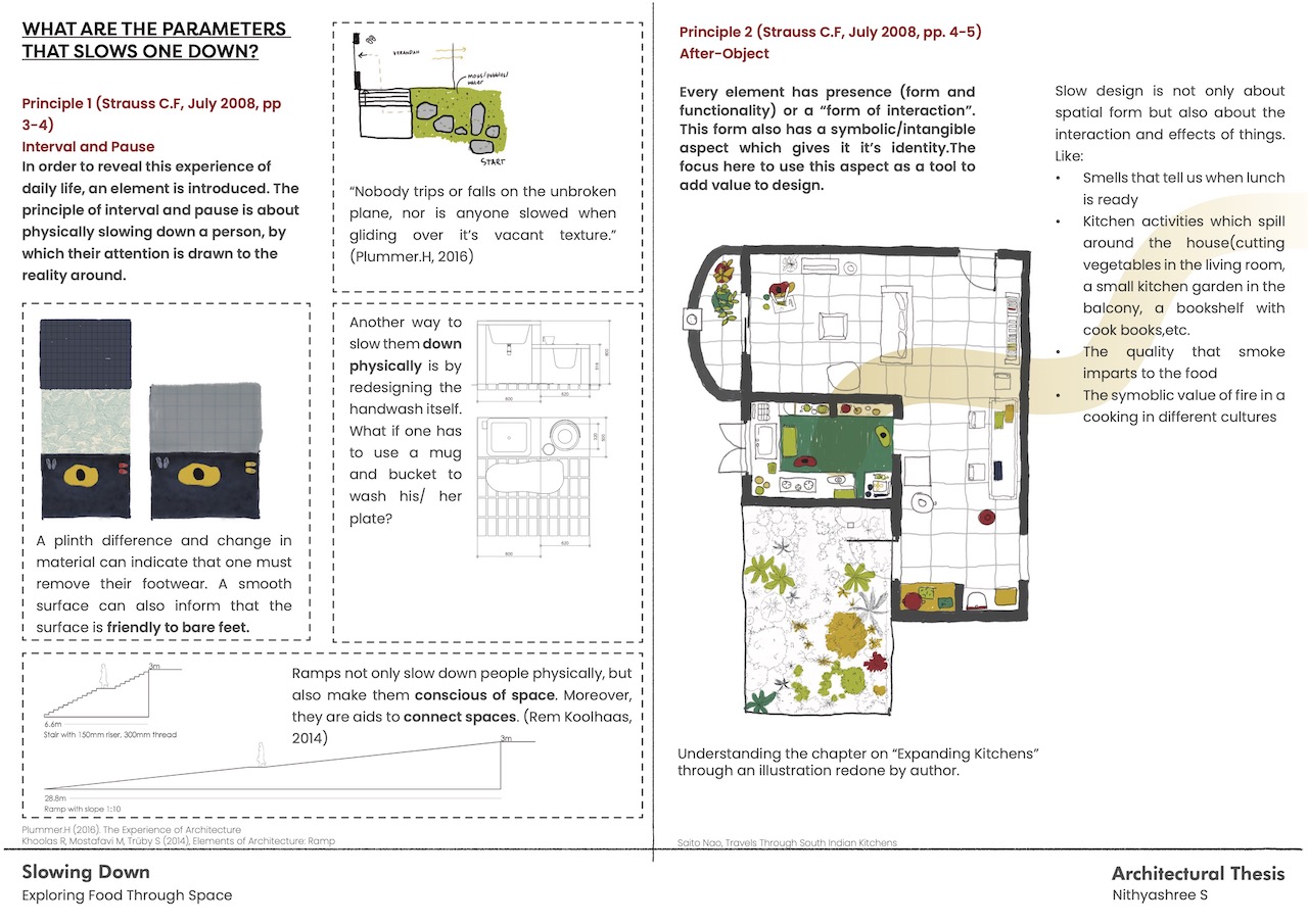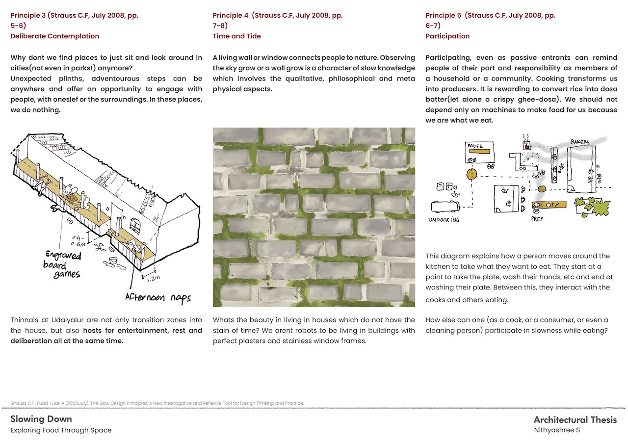 Nithyashree (WCFA, Batch 2017) comprehensively translated the initial research into design principles and spatial ideas. From the beginning, she sharply curated her intuitive sense of reading architectural space and environments into a focussed research on slowness and food. Her elegant and delicate drawing capabilities helped her carry the intricacies of slowness from an intellectual framework into an intuitive design process. I was also fascinated by her reading of an ordinary and simple space like Revamma’s mess and also imagine richer spatial possibilities in it. It was engaging to see Nithya pay attention to subtle environments and architectural possibilties hidden in the chaos of urbanity of Bangalore.