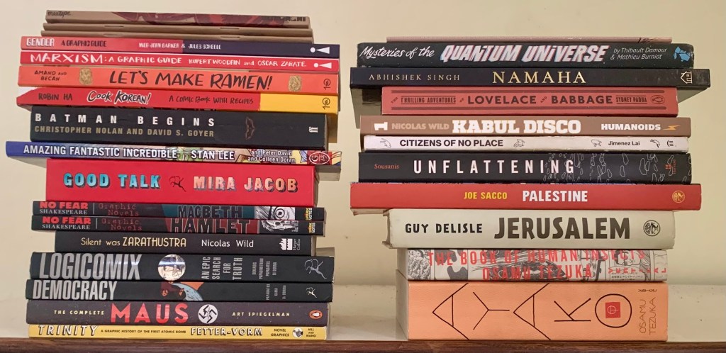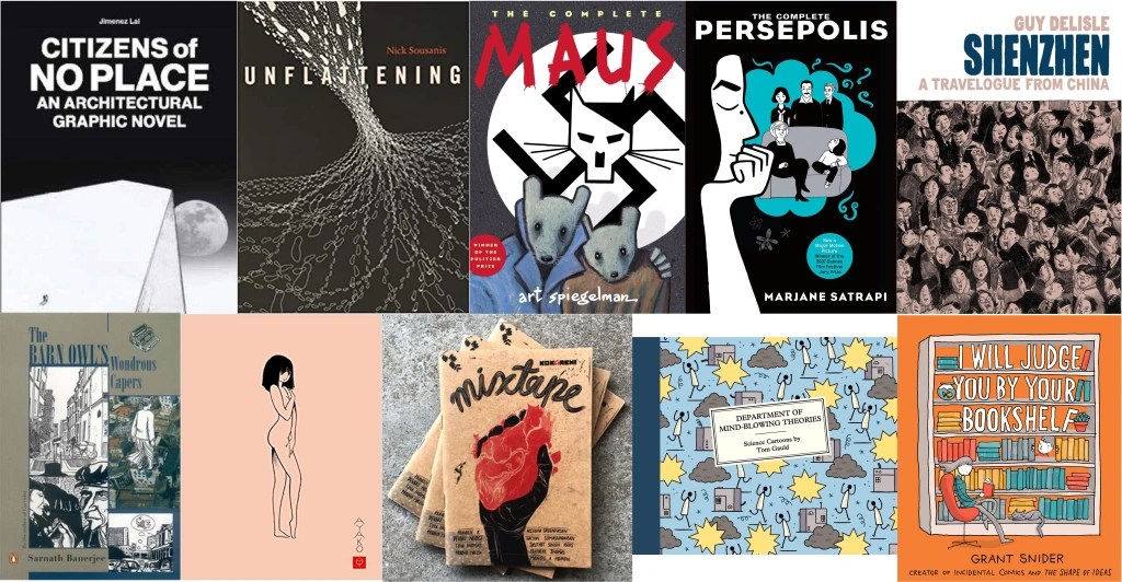 This is an invited post written by Shreyas Baindur . Shreyas and me have been teaching together for few years now. He introduced me to the amazing world of graphic novels. It was through the WCFA Book Club that we became friends. Shreyas used to bring frequently these graphic novels to the discussion and completed them at an alarming rate, when the other members like me were moving at a snail’s pace to complete the books. I had my prejudice then that these books were easy to read as they had a lot of pictures or only pictures . A shallow reading of what graphic novels meant from my side then. Then he introduced us to brilliant book – Unflattening, by Nick Sousanis – a Phd thesis in the form of a graphic novel. This book unfastened my opinion on what graphic novel means. The structure and the format is so suited to architectural thinking – this is thinking in visual from. So I invited him to put together a list of ten books as a starting point for those interested in this genre. Shreyas is well known between students for his sharp observations and the quiet sarcasm in design discussions. You will recognise a similar tint in this text too. Here is a pic of his envious collection of bookshelf (one of them) dedicated only to graphic novels.
