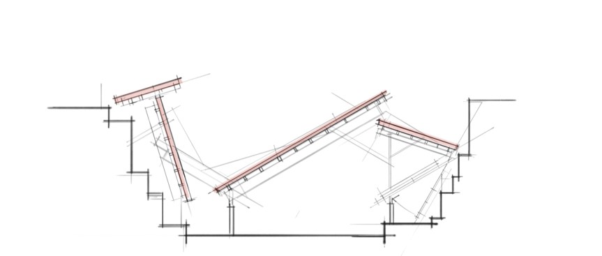 A strongly modulated, weighted ground paired with a lighter, almost dematerialised roof sets up a clear gravitational dialogue: the ground as anchor, the roof as release. The roof “wanting to float” but being held down suggests a tension between earth and sky, heaviness and lightness, permanence and transience. This is not accidental—it frames architecture as something negotiated between forces, not simply assembled.
